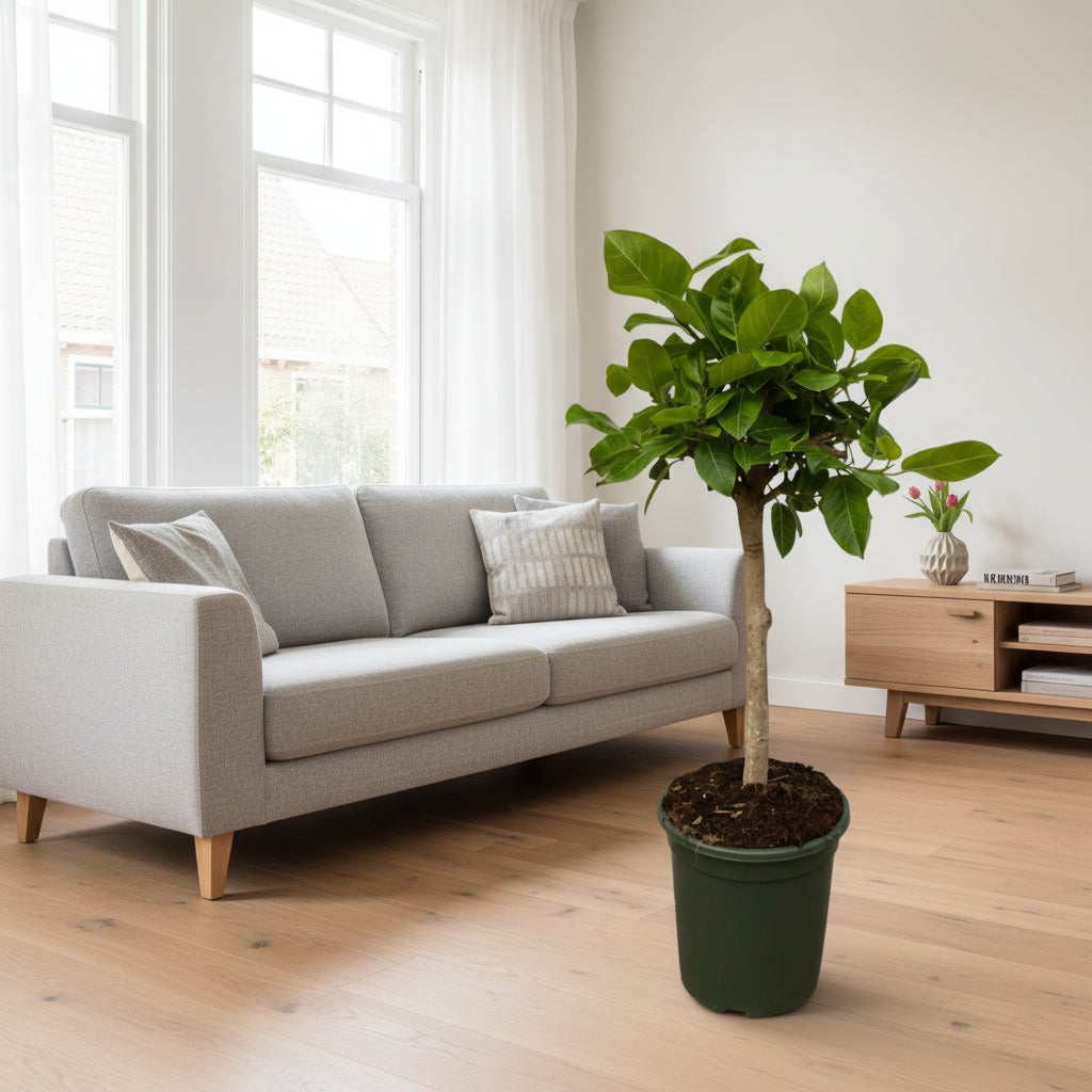 Lichtbehoefte: De Ficus gedijt goed op een lichte plek met indirect licht. Direct middagzon vermijden om bladverbranding te voorkomen. Stabiliteit is belangrijk: kies een vaste plek en verplaats de plant zo min mogelijk.